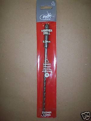 A 6mm hammer drill bit, 210mm long by Pro high quality drills.